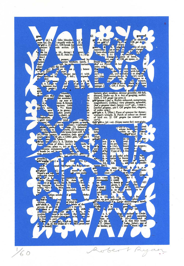 Two colour screenprint printed in blue and black on Somerset Satin 410 GSM paper.
